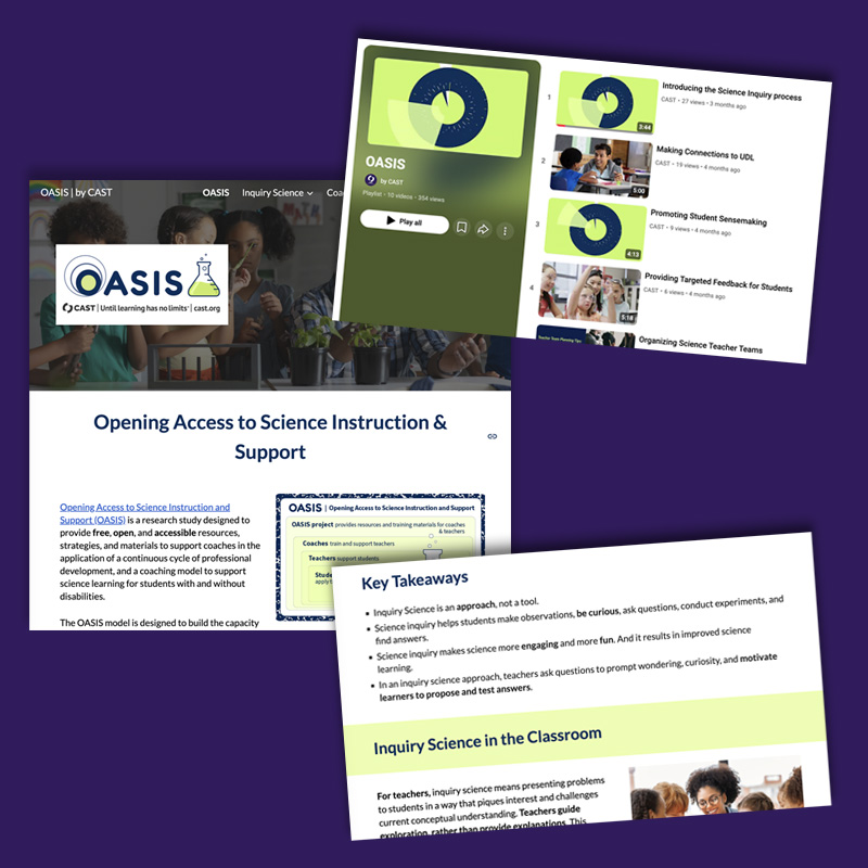 In 2021, CAST was awarded a U.S. Department of Education Office of Special Education Programs (OSEP) grant to provide technology-based professional learning for educators to support students with disabilities. This project, Opening Access to Science Instruction and Support (OASIS), developed a scalable approach for instructional coaches to use when working with elementary teachers in inclusive classrooms. The OASIS project prioritizes engagement with the inquiry process and ensuring opportunities for every learner through the Universal Design for Learning (UDL) framework.